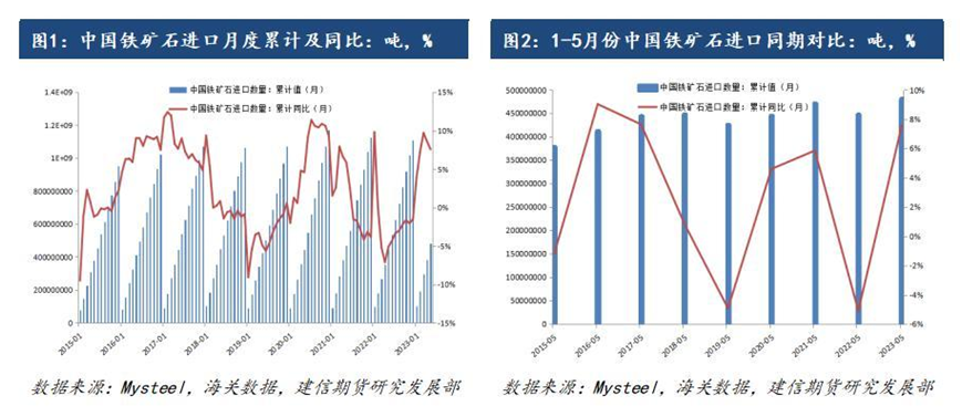 據我的鋼鐵網數據顯示,今年1-5月份中國鐵礦石進口量達到4.8075億噸,同比增長7.7%,從絕對值數量上來說,已經超過2021年同期的最高值4.7093億噸,再創歷史同期新高。從今年1-5月份進口數據來看,2023年我國鐵礦石進口規模或再度走高,不排除將創下歷年鐵礦石進口量新高的可能。