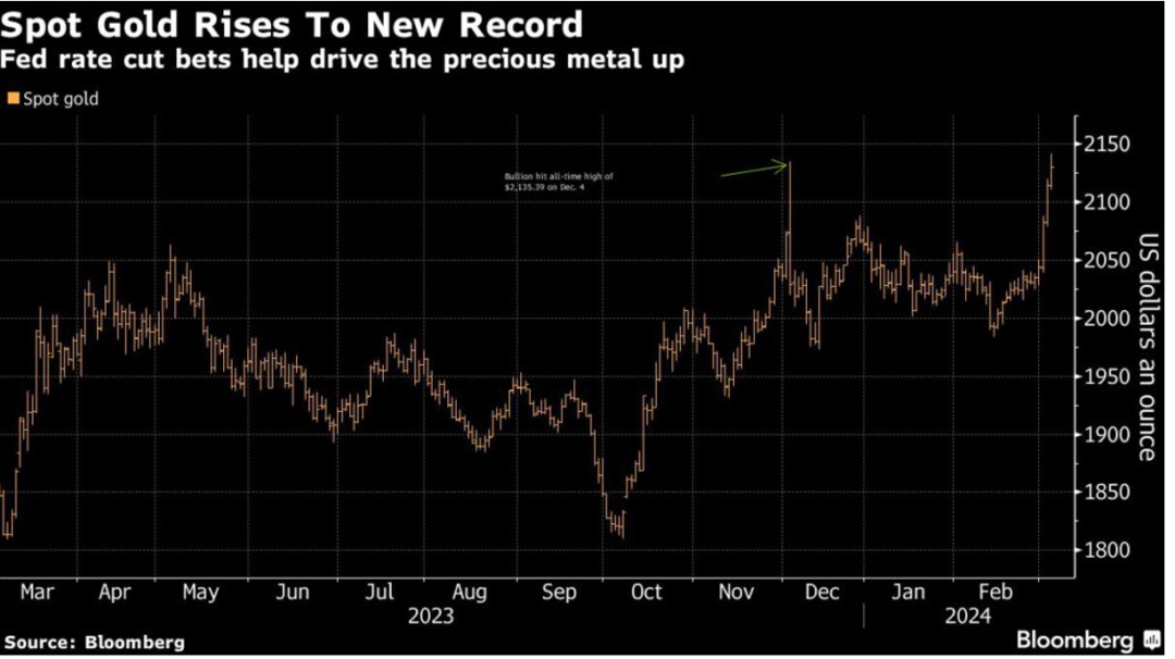 自2月28日至今,國際金價連續(xù)上漲。3月5日,現(xiàn)貨黃金價格創(chuàng)歷史新高,一度達到2141美元/盎司,打破了去年12月4日創(chuàng)下的每盎司2135.39美元的紀(jì)錄。國際金價在過去五個交易日上漲超過100美元。而據(jù)媒體從多個黃金珠寶品牌獲悉,其3月5日公布的國內(nèi)足金首飾價格均突破645元/克,在前一日歷史高位的基礎(chǔ)上,再創(chuàng)新高。