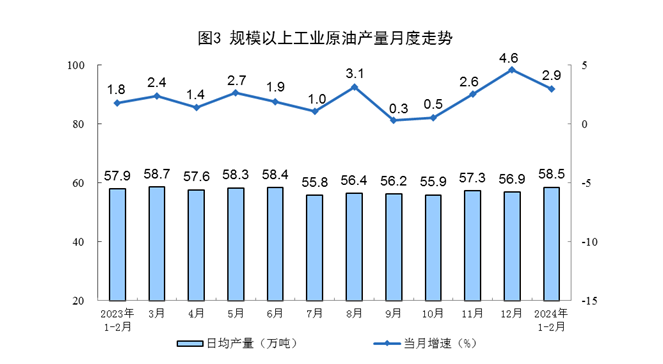 原油生產穩定增長,進口增速加快。1—2月份,規上工業原油產量3511萬噸,同比增長2.9%。進口原油8831萬噸,同比增長5.1%,增速比上年12月份加快4.5個百分點。